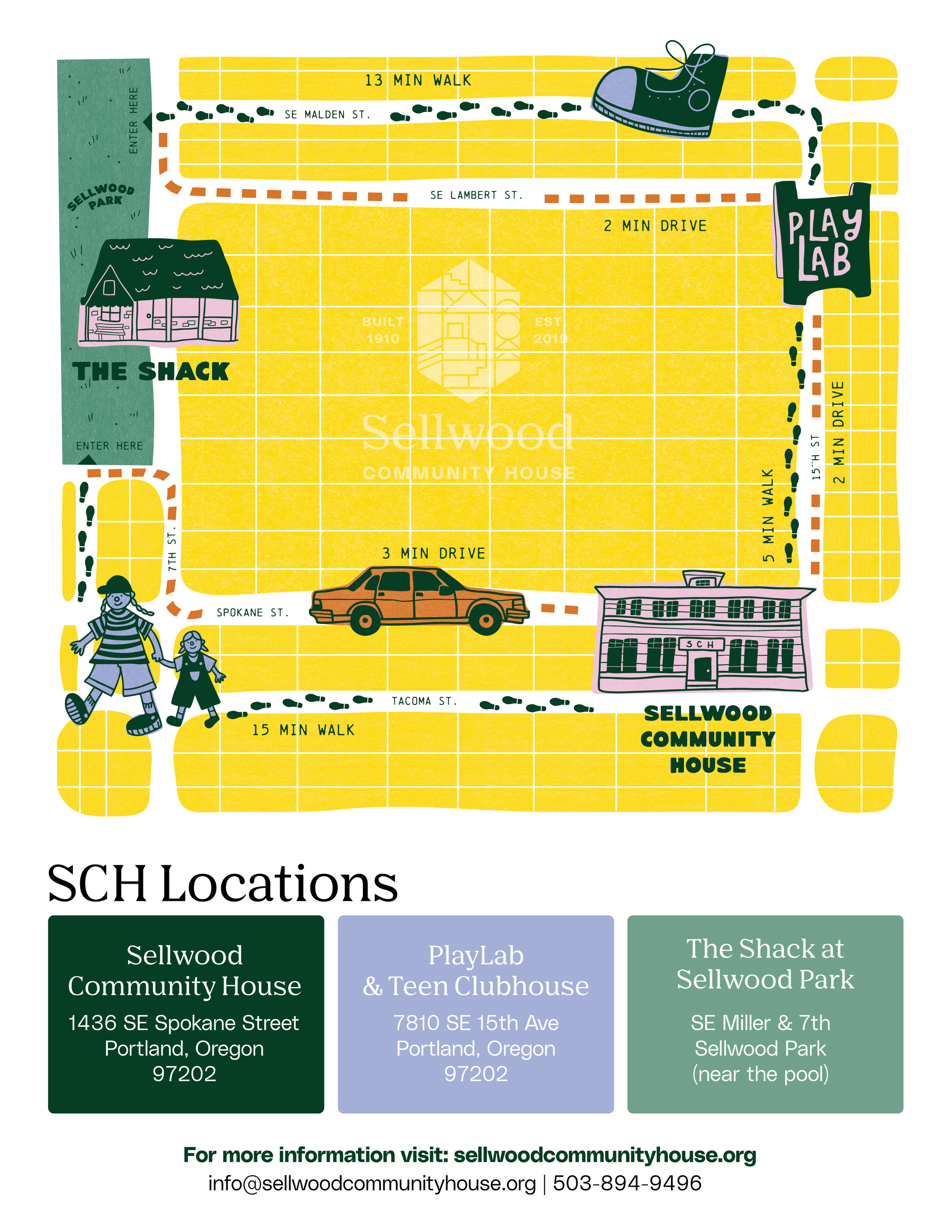 SCH Has Three Main Locations for ProgrammingSellwood Community HousePlayLabThe Shack at Sellwood Park Click Here to Download Our Locations Map