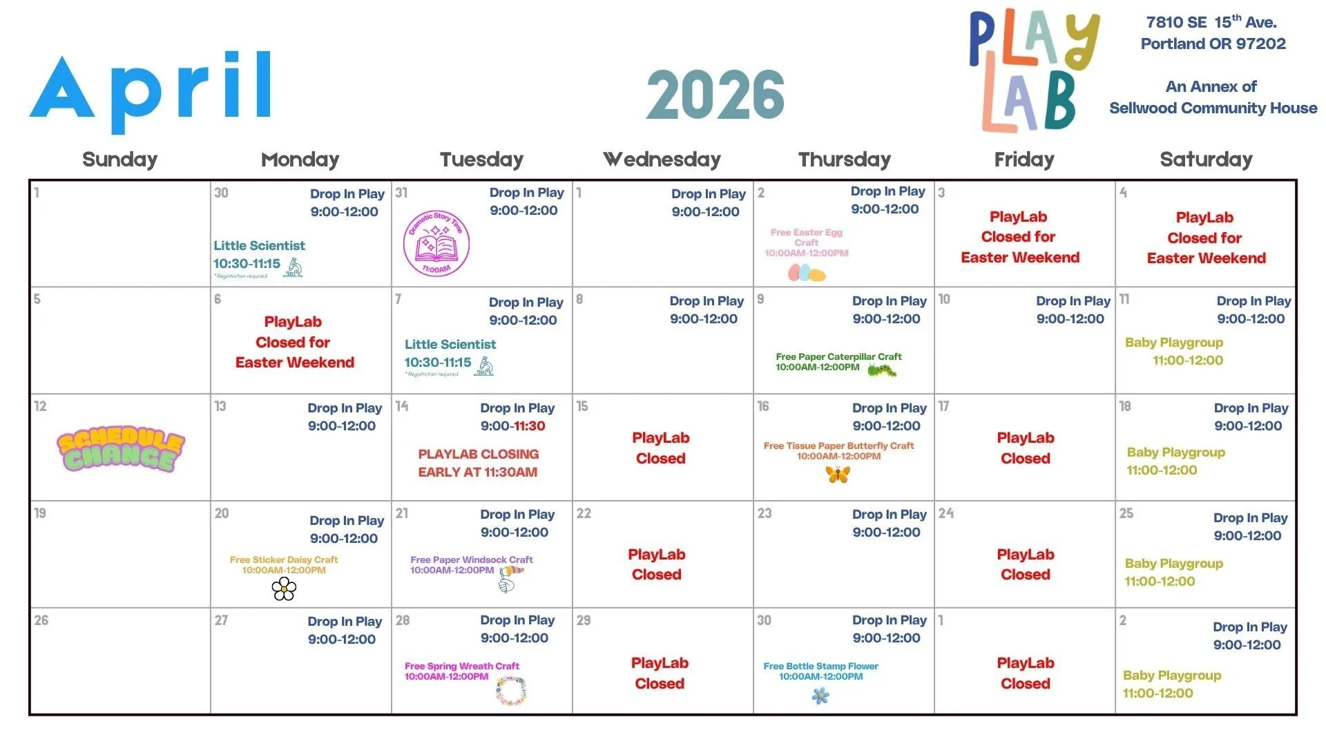 PlayLab is an annex of Sellwood Community House, located at 7810 SE 15th Ave — just four blocks north of SCH at SE 15th & Spokane.